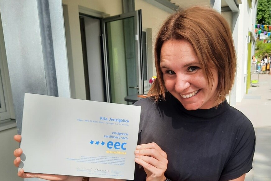 Am 9. Juni 2022, zeichnete der ***eec-Rat des Vereins „Early Excellence – Zentrum für Kinder und ihre Familien e. V.“, die Kita „Jenzigblick“ mit der Zertifizierung „***eec-deutschland“ aus. Heide Broda, Leitung der AWO-Kita Jenzigblick, nahm die Zertifizierungsurkunde entgegen.
