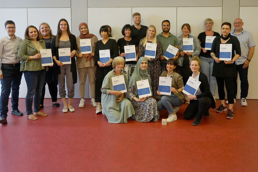 In Anwesenheit von Mesehalit Alemayehu vom Stadtschulamt Frankfurt und Andreas Reith, Early Excellence-Koordinator, wurden die Zertifikate und die Anstecknadeln den stolzen Fachkräften überreicht.