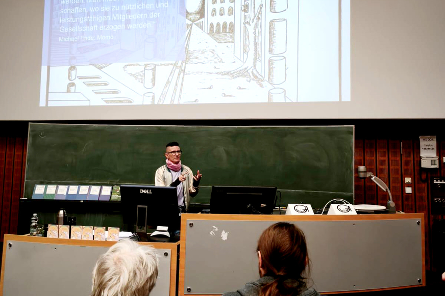 Kinder brauchen für eine gesunde Entwicklung das Sein im Hier und Jetzt mit sich selbst, mit uns Erwachsenen und mit ihrer Umgebung in besonderer Weise. Die beiden Hauptvorträge „Mit dem Kind in seiner Zeit sein“ von Prof. Dr. Joachim Bauer und „Die Entdeckung der Langsamkeit – das eigene Entwicklungstempo leben“ von Dr. Ann-Katrin Bockmann haben viele Teilnehmer*innen nachdenklich gestimmt. Auch der musikalische Beitrag von Marleen Dahms und Felipe Aravena war passend dazu ausgewählt. Sie interpretierten dabei auf berührende Weise unter anderem das Lied „Kleine Hände” von Bettina Wegner.